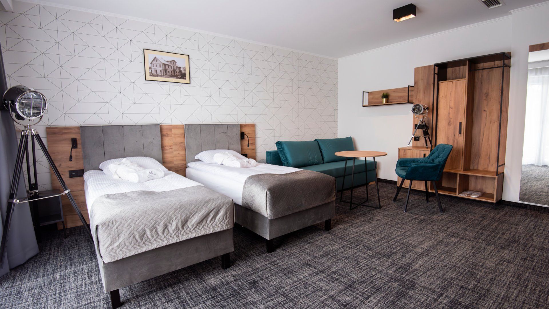 Apartament z dwoma pojedynczymi łóżkami z możliwością złączenia w łóżko małżeńskie. Rozkładana sofa dla dwóch osób. Okna wraz z balkonem wychodzące na stronę południową.
