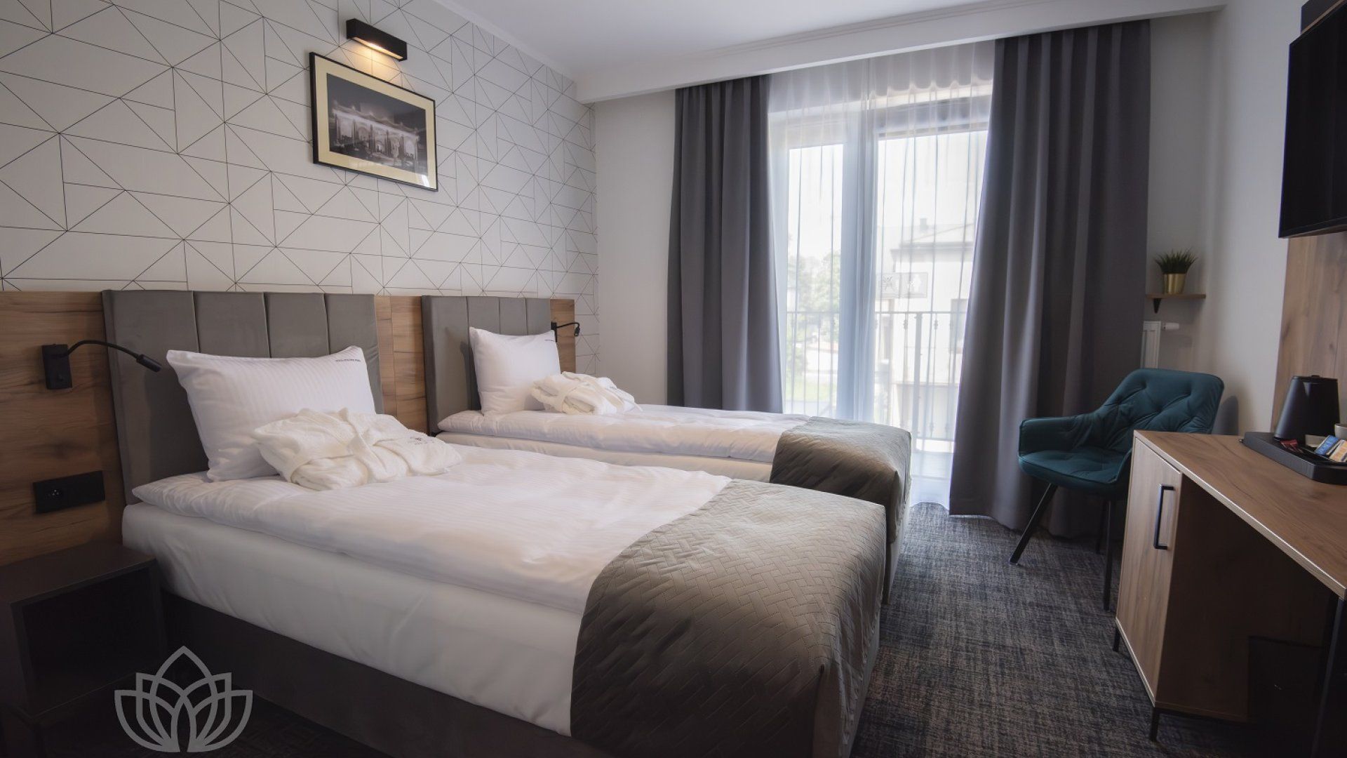Dwuosobowy pokój Superior z dwoma pojedynczymi łóżkami z możliwością złączenia w łóżko małżeńskie. Okna wraz z balkonem wychodzące na stronę północną.